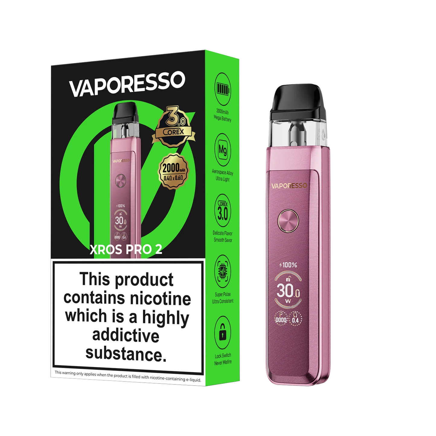 O Vaporesso XROS Pro 2 é um pod system premium de alto desempenho, destacando-se pela bateria interna de 2.000 mAh, potência ajustável até 30W e o sabor aprimorado pela tecnologia COREX 3.0. Com um design ergonômico em liga de magnésio, possui tela TFT de 0,96 polegadas e é compatível com todas as cápsulas da linha XROS.